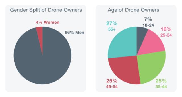报告显示,在英国拥有无人机的用户中,男性占96%,45岁以上的占52%,综合年龄和用户比重,感觉还是国内比较容易撩到女飞手。