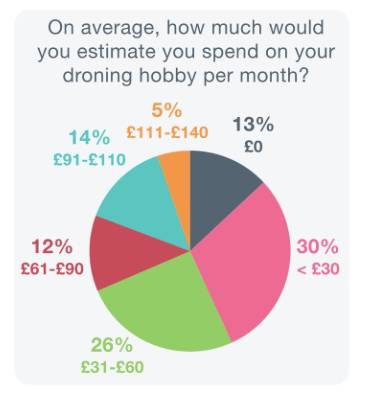 30%的用户平均每个月在无人机上花费30英镑(269元人民币),26%的用户每个月花费31到60英镑,13%的用户花费91到110英镑(950元人民币)。
