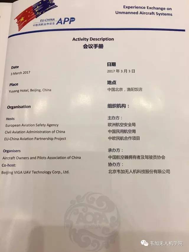 中欧无人机管理经验交流会于2017年3月3日在京召开。此次会议由中国民用航空局、欧洲航空安全局和中欧民航合作项目主办,中国航空器拥有者及驾驶员协会(中国 AOPA)承办,北京韦加无人机科技股份有限公司协办。旨在共同探讨未来无人机管理新方法和新技术发展方向,交流中欧民用无人机政策法规、管理理念及新技术。中国民用航空局飞行标准司朱涛副司长和欧洲航空安全局Stephan Baertges先生出席研讨会并致欢迎辞。来自国家各部委,包括国家空域管理中心、空军参谋部航空管制局、工信部装备工业司、公安部警用航空管理办公室、中部战区空军参谋部航管处、首都综治办等;以及中国民用航空局、欧洲航空安全局和中欧无人机企事业相关单位等150余位参会代表出席此次会议。