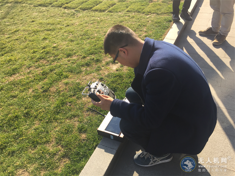 海康技术人员正在连接信号,通过平板电脑观看无人机图传画面