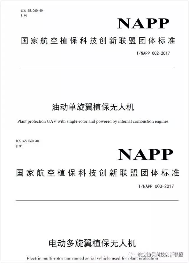 2017年3月6日,《油动单旋翼植保无人机标准》和《电动多旋翼植保无人机标准》作为农用植保无人机首批团体标准正式发布,标准编号为T/NAPP 002-2017和T/NAPP 003-2017。