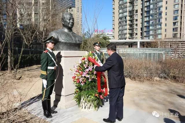 揭牌仪式前,李玉海带领总部各部门领导向全国优秀共产党员、航空人楷模吴大观、罗阳同志的雕像敬献花篮,表达对两位航空工业英模的崇敬之情和缅怀之意。