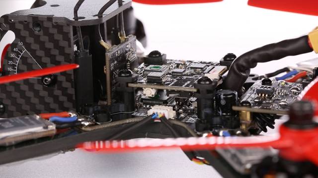 Furious215采用X型长方形的机架设计,飞行平滑流畅。而电池下挂的设计,在降落时容易损坏电池,对降落技术的要求很高(对的,大部分飞手都是采用暴力降落...),而电池上挂能够降低电池损伤的风险。