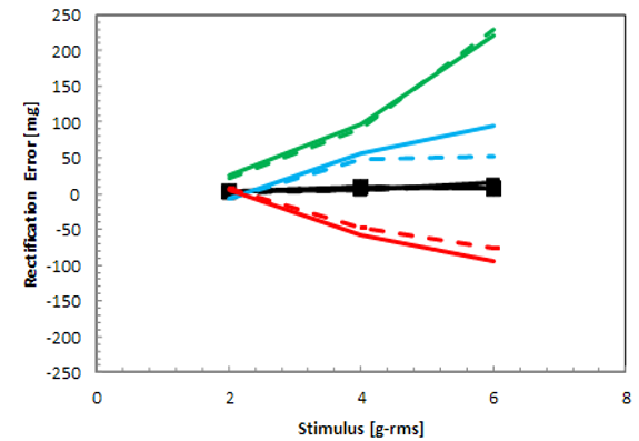 而对于为何要进行温控和减震,赵延辉先生则认为:“温控是因为所有的MEMS器件都会有温漂,比如零点和灵敏度都会随着温度变化。用户有夏天在海南、新疆飞的,也有冬天在辽宁、黑龙江飞的,温差几十甚至上百度,怎么办?很多用户想到了全温范围内的温补校正,但问题是消费类MEMS传感器的温漂线性度不好,必须用分段线性或二阶甚至更高阶的温补校正才行,这无形中增加了很高的人力和时间成本。更头疼的是,有些消费类器件温度回滞特性和重复性很差,造成无法校正的问题,要把这些器件再筛选出来,成本会更高。基于此,研发人员只能采用类似于加热电阻的办法来让MEMS传感器的环境温度近似恒定在一个较高值来避免温补校正。即使这样,没有全温范围内的温补校正,还是很难保证飞行器在各种温度条件下都能出色飞行的。而至于为什么要减震,则是因消费级的三轴加速度计和三轴陀螺仪对振动都非常敏感,在较强的振动状态下,它们的输出都会出现很大的偏差。加速度计有振动整流误差,在振动状态下,经滤波后,零点还是会出现偏差。如下图所示,黑色的线是一个ADI工业级双轴加速度计在振动状态下滤波后的结果。其它颜色的线是三轴高端消费级加速度计在振动状态下滤波后的结果。可见即使是高端消费级加速度计在振动状态下,各轴都会出现较大偏移。某些器件的某些轴向的零点偏移甚至在6g-rms的振动下达230mg,而在利用加速度算倾角的时候,这一偏差会带来高达13度的误差。”