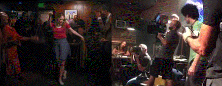 热恋中的Mia和Sebastian晚上最喜欢去小酒吧。一个在舞池跳舞,一个在舞台弹琴,他俩总配合得天衣无缝,太赞了。(镜头特点:镜头快速转换)