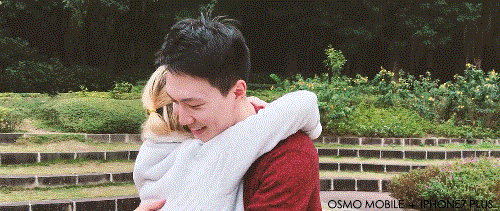 这次使用了Osmo Mobile的智能跟随功能,采取了平移加上环绕的两个拍摄手法,先是侧拍男孩往前走……当两人遇见并拥抱之后,镜头对着他们环绕走一圈。