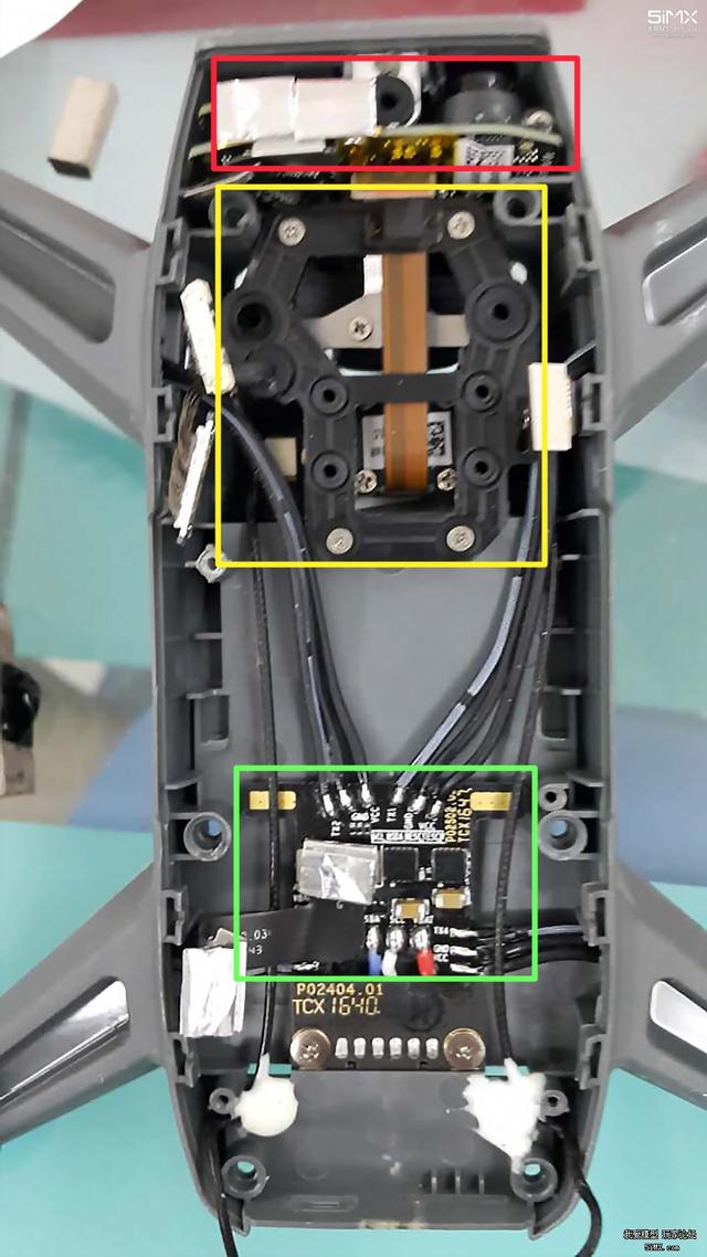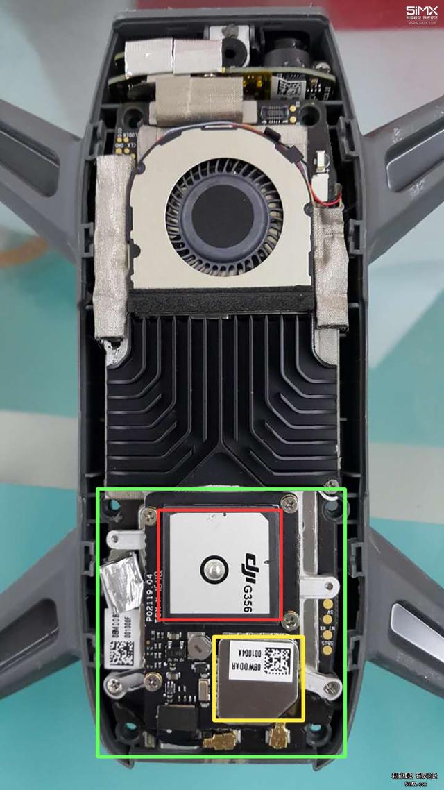 接着是将机身上壳拆开,Spark的内部设计非常紧凑,散热风扇和导热片占据了很大空间,散热板下可能为图传模块,红色方框应该为GPS天线,黄色方框为GPS信号数据处理单元,绿色方框疑似飞控。