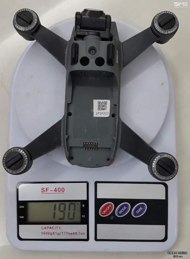 Spark不含电池的重量为190g,作为参考,御不含电池的重量为500g左右。另外四个电机下方位置为指示灯。