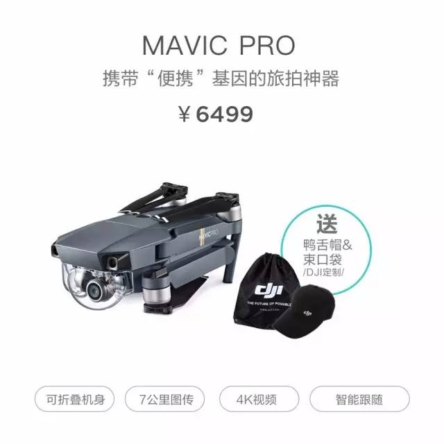 如果要说到旅拍神器,Mavic Pro当之无愧。它小巧的可折叠机身能让你轻松随身携带去往目的地。现在购买限量赠送DJI定制鸭舌帽和束口袋,让你无惧户外阳光,畅快爽飞。
