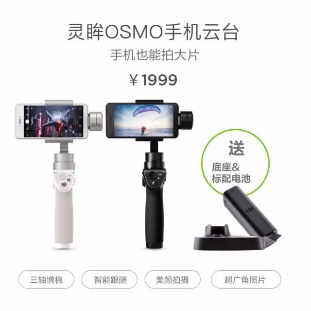 Osmo Mobile可智能跟随及拍摄超广角全景照片,并且和直播无缝对接。你可以随手拍出大片般动感的视频,还能通过丰富的智能功能进行自动跟随,捕捉延时视频,随时随地分享至社交平台,创造出惊艳朋友圈的影像效果。现在购买,即可获赠底座+智能电池。
