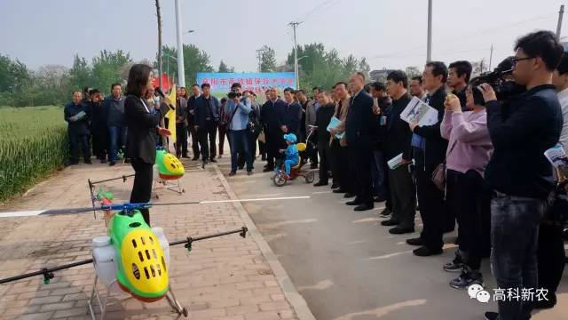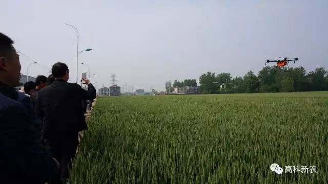 演示现场,高科新农植保无人机飞舞在麦田上,让现场众多群众、种粮大户大开眼界,拍手称赞,纷纷拿起手机拍照。