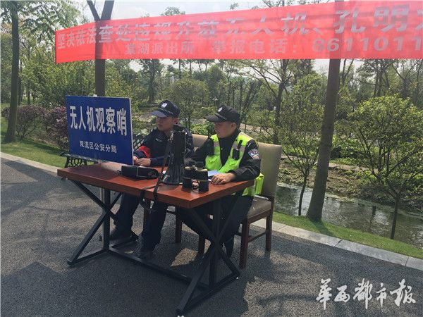 29日下午,记者来到成都警方设置的监测点位现场探访,在成都双流凤翔湖内的这个观测点,是此前时常出现无人机爱好者聚集的点位。记者看到,两位民警正在现场执勤,负责两公里范围内的观测,另外三个民警则负责在网格内来回巡查是否有黑飞。
