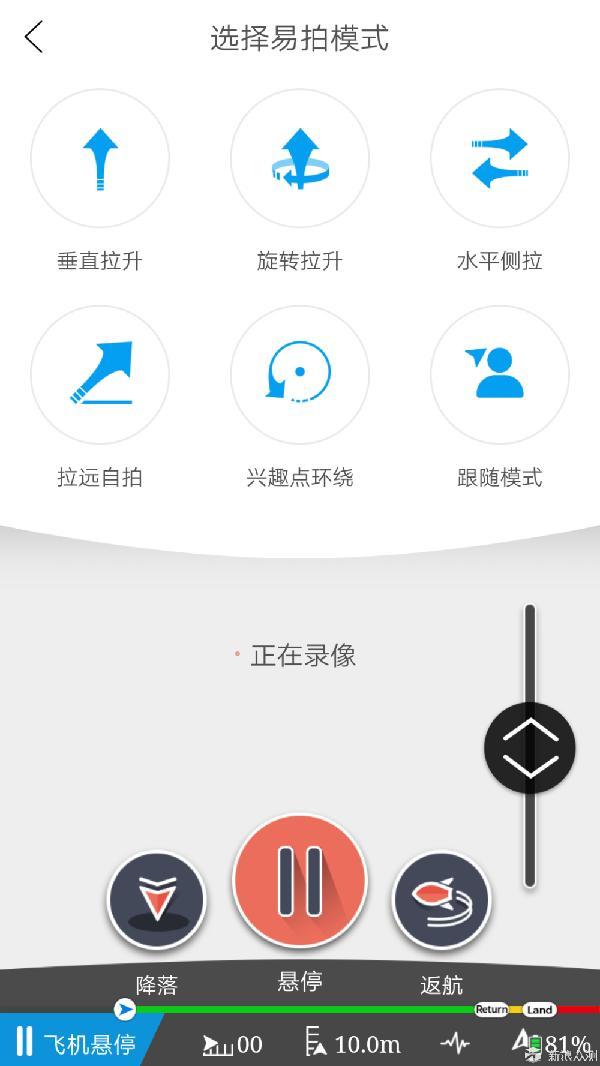 接下来是新推出的“易拍模式”。简而言之,它就是把一些无人机的复杂操纵变得简单化了,一键即可完成,并且全部集成在一个模式里,增加了无人机的可玩性,降低了操作难度,无论是娱乐还是航拍都特别方便。