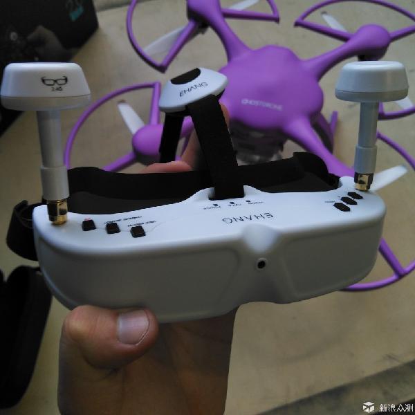 这个VR眼镜(准确的说是FPV眼镜)是画面的载体,既是信号收发器,也是云台相机的控制器。两个立起来的“小蘑菇”即为2.4G数传和5.8G图传天线,戴上眼镜之后可以看到云台相机的画面,也可以通过抬头低头来调整相机的上下旋转;位于眼睛前方的“小黑点”是他的摄像头;上方的按钮可以进行一些关于眼镜的简单设置,如搜索相机的信号、切换云台和眼镜之间摄像头的画面等等。