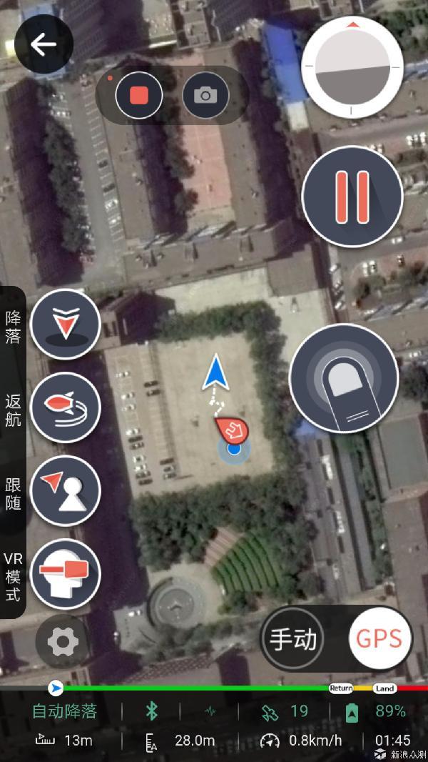 第一次飞行默认指点飞行教学模式,完成教学即可自由操作了。大家测,顾名思义,就是大家一起上厕所指点飞行,顾名思义,就是通过点击地图上位置设定目的地,让飞机自主飞行;起飞之后也可以通过屏幕上的按键手动操作飞机飞行。教学简单明了,操作轻松易学,学习门槛极低,的确应了亿航的那句广告语“会用手机,就会操作无人机”。