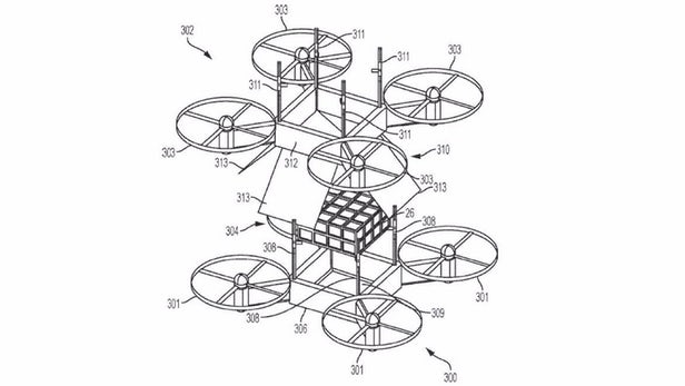 在专利描述中,货运无人机在肚子部分安装了可以移动的导板,包裹放在其中,在底部安装带有电磁耦合装置的可伸缩产品,不过在商业端版本中顶部还有一个带对接机制的机械臂控制。