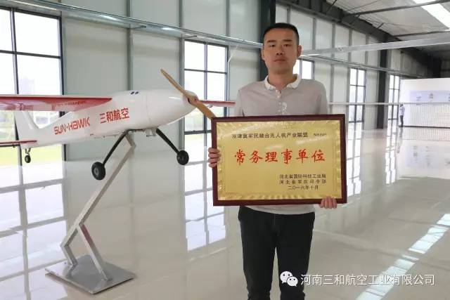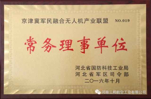 河南三和航空工业有限公司获得了由河北省国防科技工业局、河北省军区司令部颁发的京津冀军民融合无人机产业联盟“常务理事单位”,这标志着我公司的产品将会为我国的国防建设工作做出相应贡献。