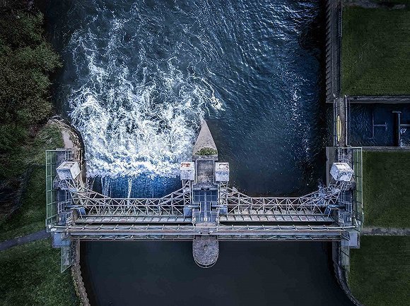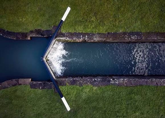 约克郡东部的波克林顿运河正在开锁,上游激荡出水花