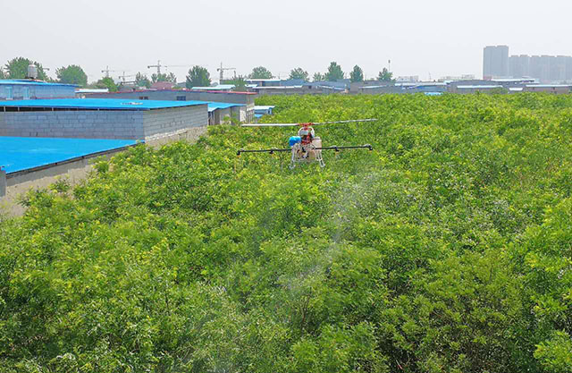 随着气温、湿度不断升高,病虫害进入高发期。5月9日,阜阳市颍泉区苗圃园林的负责人杜先生联系了安徽天鹰兄弟利用植保无人机对园区的槐树进行喷药防治虫害。园林树木种植600亩,近期槐树遭遇了虫害,急需做好虫害防治措施。 来到槐树园,走近一看,让人毛骨悚然,只见槐树上挂满了吐着细丝、上下蠕动的虫子,还有倒挂在细丝上来回晃动,部分槐树叶子已经被啃食殆尽。