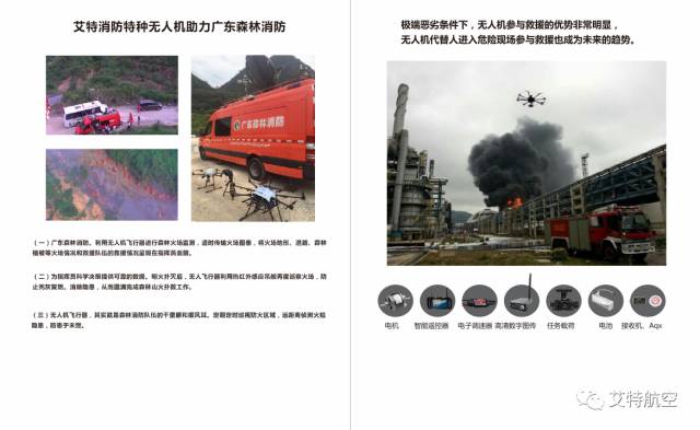 国内首款进入商用的ATUH-20涡喷无人直升机就是由艾特自主研发的,为目前国内载重最大的民用涡轴动力无人机,能实现全程自主控制飞行。2014年艾特又在国内率先推出首款油电混合动力AT-100反恐无人机,AT-100突破了常规多旋翼飞行器的行业技术瓶颈,载重量达到10KG,续航时间长达1小时以上,填补了国内空白,在2014高新技术成果交易会一亮相受到国内外关注和好评,艾特无人机可广泛应用于:科研飞行平台、航空摄影、植保作业、紧急救援、电力巡线、勘探测绘、安防等领域。