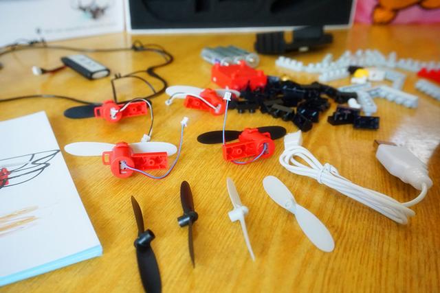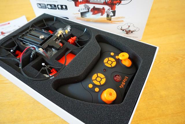 打开包装,第一映入眼帘的是一本说明书,里面是一些积木的散件和一个专业的无人机遥控器。