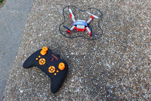 其实对于遥控器的掌控刚开始是需要学习一段时间,因为灵敏度还是比较大。所以首次试飞时就是各种撞击,但完全不用玩普通无人机时炸机的危险,经历过各种撞墙,衰地,撞树,尽然毫发无损。不过两个积木搭的支撑脚确实容易掉,所以每次飞的时候直接卸了,并不会影响飞行。因为机身携带锂电池仅600mAh,所以每次飞行的时间都在十分钟以内,但对于孩子来说已经足够。