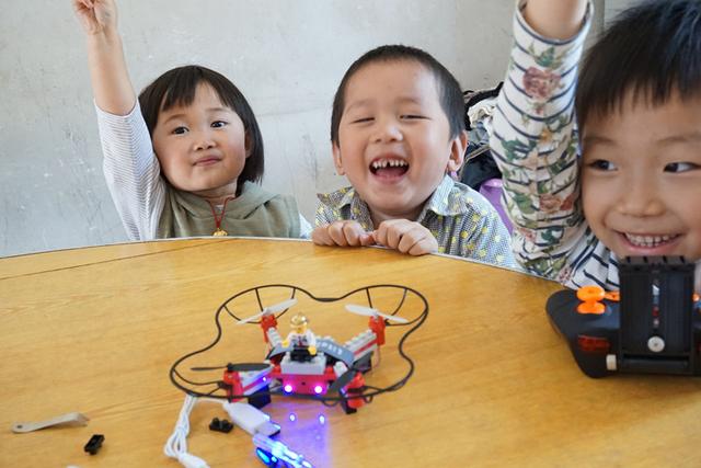 经过三个小朋友的不懈努力,终于在大概四十分钟左右,完全通过自己阅读说明书,把整个无人机搭好了,说明书都是图解,所以对于孩子并没有多大的问题,而且在拼接的时候,孩子们也会问,这个是干什么,那个是干什么的,把无人机的主体结构和细节都了解的七七八八,带摄像头主控、机翼、无线遥控器、锂电池、保护罩和充电器等等。当全部完成后,三个小孩脸上满满的成就感,别提多开心了。