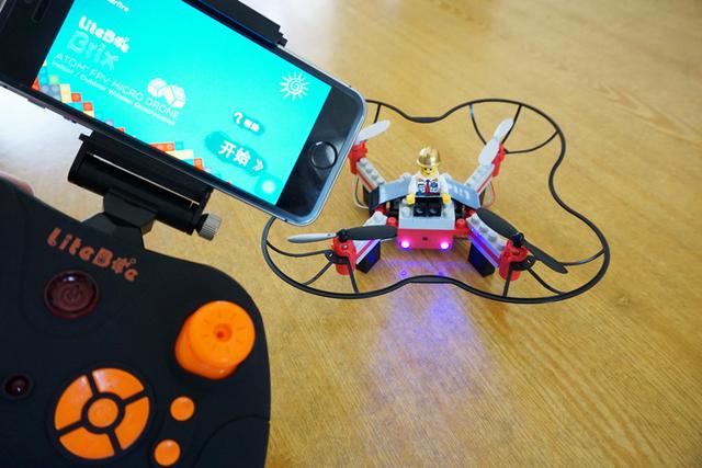 LiteBee Brix DIY 积木无人机有两种遥控模式,直接用手柄遥控和手机app遥控。用手柄遥控,无人机接通电源,手柄开机,即能用左边摇杆上推起飞。如果要切换手机,手机需要在wifi里搜索“LITEBEE_BRIX”等字样的热点,然后打开事先下载好的手机APP,用遥控手柄两个摇杆同时往中间往下推,即可以切换到手机遥控模式。