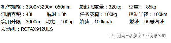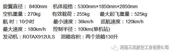 河南三和航空工业有限公司成立于2014年,注册资金6600万元,是专业从事自转旋翼机、大型无人飞行器设计、研发、制造、销售的专业公司,公司的所有产品均为自主研发,拥有多项专利技术和自主知识产权,公司生产基地位于河南省郑州市通航试验区,紧邻连霍高速,厂区直连上街机场跑道,占地面积三万平米。公司组织结构为董事会领导下总经理负责制,下设研发部、适航办公室、生产部、市场部、财务部、后勤部。公司现有职工30人,董事会3人,高级工程师5人,博士3人,硕士4人。