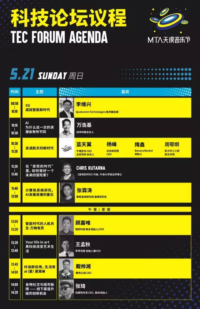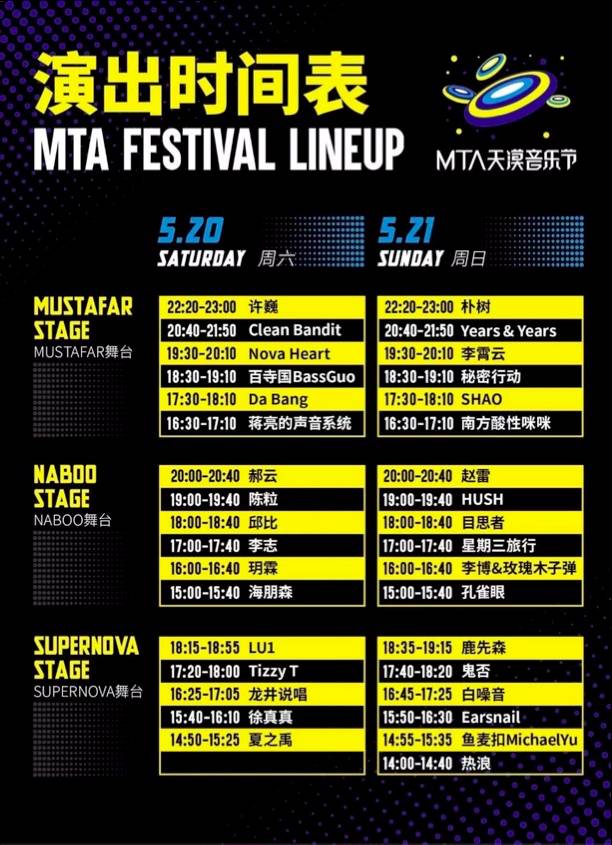 Years & Years、Clean Bandit、许巍、朴树、李志、赵雷、郝云、陈粒、李霄云、Hush、邱比......在神秘沙漠中,更有神秘嘉宾莅临现场!5月20日-5月21日,怀来天漠,MTA天漠音乐节将在此举办一场盛大的Party,音乐、艺术、科技融为一体的未来大趴。