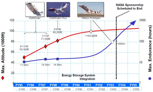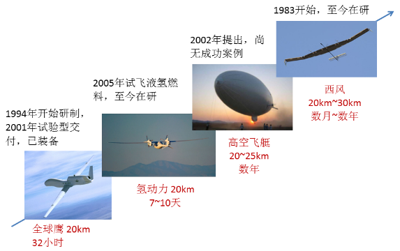 美国国防部预研局“秃鹰”计划:目的是寻求提供一种可保持在18.3km~27.4km高度、携带450kg有效载荷、机上功率5kW、续航时间超过5年、可在99%的时间内保持在任务空域中的固定翼飞行器。波音/奎奈蒂克公司团队提出的“太阳鹰”方案中标。