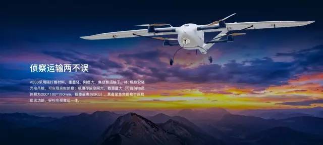 V330集6大亮点于一身:亮点1.全球首款倾转旋翼技术;亮点2.V330最大续航时间达120分钟;亮点3.V330最大航程达130公里;亮点4.V330最大载重达5公斤;亮点5.载荷搭配灵活;亮点6.V330集侦察运输于一体。