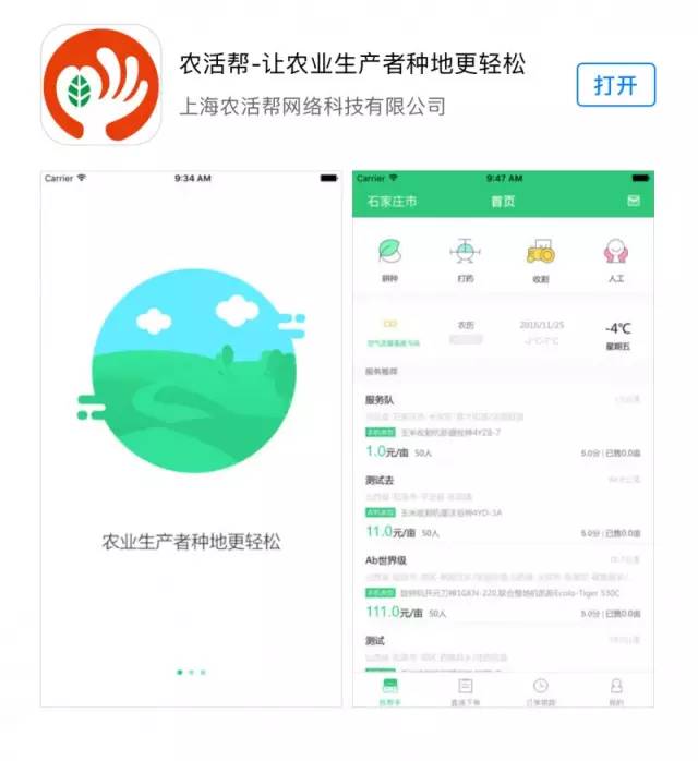 农活帮现阶段已经开发了包含农业端和帮手端的微信服务号及手机App,用互联网产品连接农业生产者和农业服务者,以智能高效农业机械的使用作为切入点,实现分工协作,提高农活效率,解决优化农业耕、种、管、收等各个环节的服务需求。并促进农活服务的标准化,达到让农业生产者种地更轻松,让农业服务者赚钱更容易的目的。