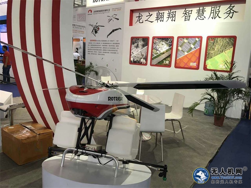 ALPAS为智能型精准农业无人机系统(Artificial Precision Agriculture System),是一款专业型多功能无人直升机,可适用于空中无人侦查监控、搜寻目标、灾难救援、摄影、农业喷洒等领域。该机采用4桨式主旋翼翼型,主要目的是增加其更大的升力,并采用特制电动无刷动力系统,从而使其具备低噪音和地震动的特点。ALPAS的负载能力优秀,其最大起飞重量可达到30kg。展会中的这款是搭载了20L的容器可用于植保喷洒作业,前端有测距仪可以很高的固定高度,尾部安装有GPS定位仪可以用于精准作业。除了机体结构以外, 其内搭载无线通讯模块的高智能自动驾驶系统,配以高规格的速度控制模块,执行完全智能的自主飞行任务。于此同时,在地面端配备了可同时內建无线通讯模块的地面控制站,并搭配了公司独有的地面自主导控软件,控制无人机执行任务从而达到实时监控。
