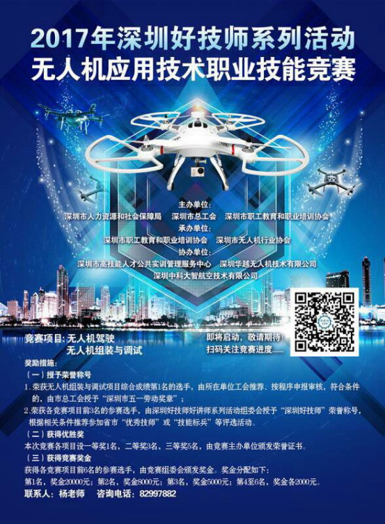 2017年深圳好技师系列活动无人机应用技术职业技能竞赛继续沿用无人机驾驶和无人机组装两个项目。获奖选手不但可以获得深圳好技师好讲师系列活动组委会授予“深圳好技师”荣誉称号和获奖荣誉证书,更有总额78000元的高额奖金,竞赛成绩突出的还将获得“深圳市五一劳动奖章”评选机会。我们真诚的邀请各位无人机爱好者前来参赛。