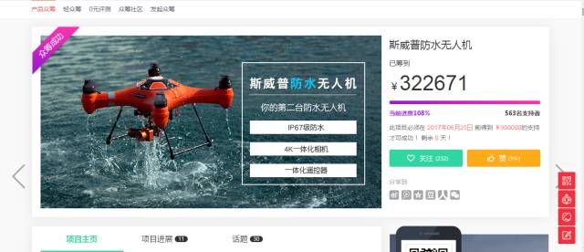 斯威普防水无人机3代水手在6月22日完成了美国知名平台kickstarter众筹,在6月25日完成国内京东众筹。同时官网,以及淘宝等产品已经开始正常上架。