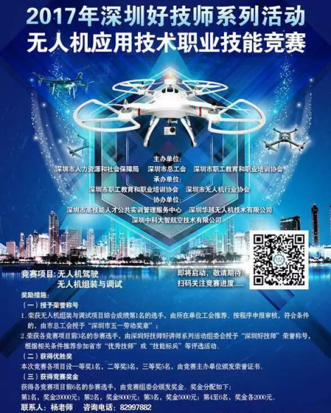 2017年深圳好技师系列活动无人机应用技术职业技能竞赛由深圳市人力资源和社会保障局、深圳市总工会、深圳市职工教育和职业培训协会主办,由深圳市职工教育和职业培训协会、深圳市无人机行业协会承办,得到了深圳市高技能人才公共实训管理服务中心、深圳华越无人机技术有限公司、深圳中科大智航空技术有限公司等单位和企业的大力支持。