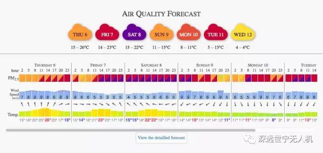 如果使用精灵系列飞行器,不建议飞手在四级以上风速(5.5m-7.9m/s)进行飞行。在 aqicn.org 天气预报网站中,可以查到全国各地的风速与风向乃至是空气质量的数据;另外使用手机 App Meteo Earth 也可以在手机端查询云量、风速、温度、陆地海面气压等详细数据,功能比较丰富。