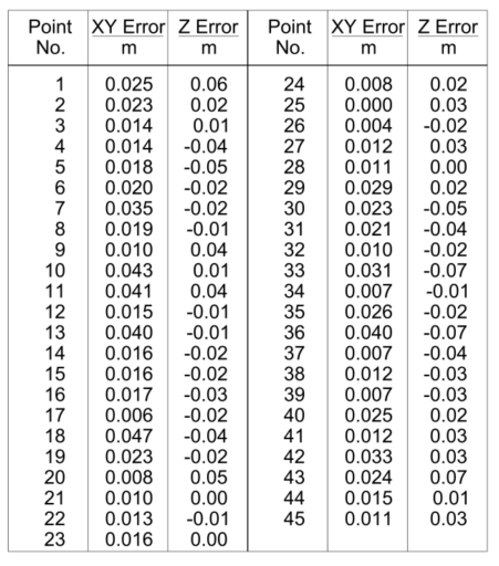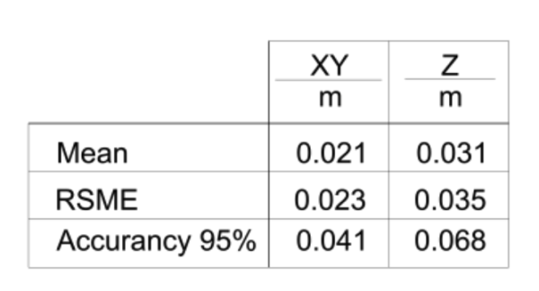 最后,研究人员使用了地理空间定位精度标准方法,第3部分:国家空间数据准确度标准,并将结果应用于95%置信水平(平均为1.7308 x RMSEr,垂直度为1.9600 x RMSEz),并得出最终准确度水平41mm,垂直68mm。