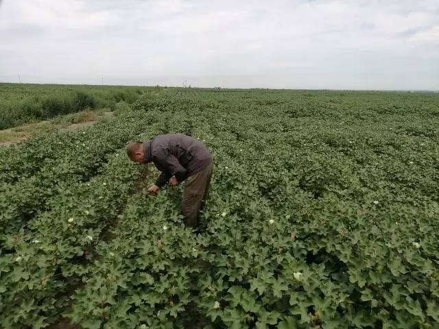 图:农药专家熊工在检测棉田施药后状况