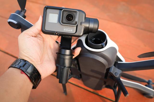 相机可以拆下来单独使用,这可能也是GoPro Karma最大的卖点之一。因为其搭载的GoPro 5可以随时拆卸,所以买了这个套装,就可以同时拥有无人机和GoPro 5。GoPro 5搭配手持稳定器,可以在地面上进行常规视频拍摄。由于GoPro 5支持自身防水,说下水拍就下水拍,可谓方便至极。这样看来,真正做到一机三用的有且仅有GoPro Karma。