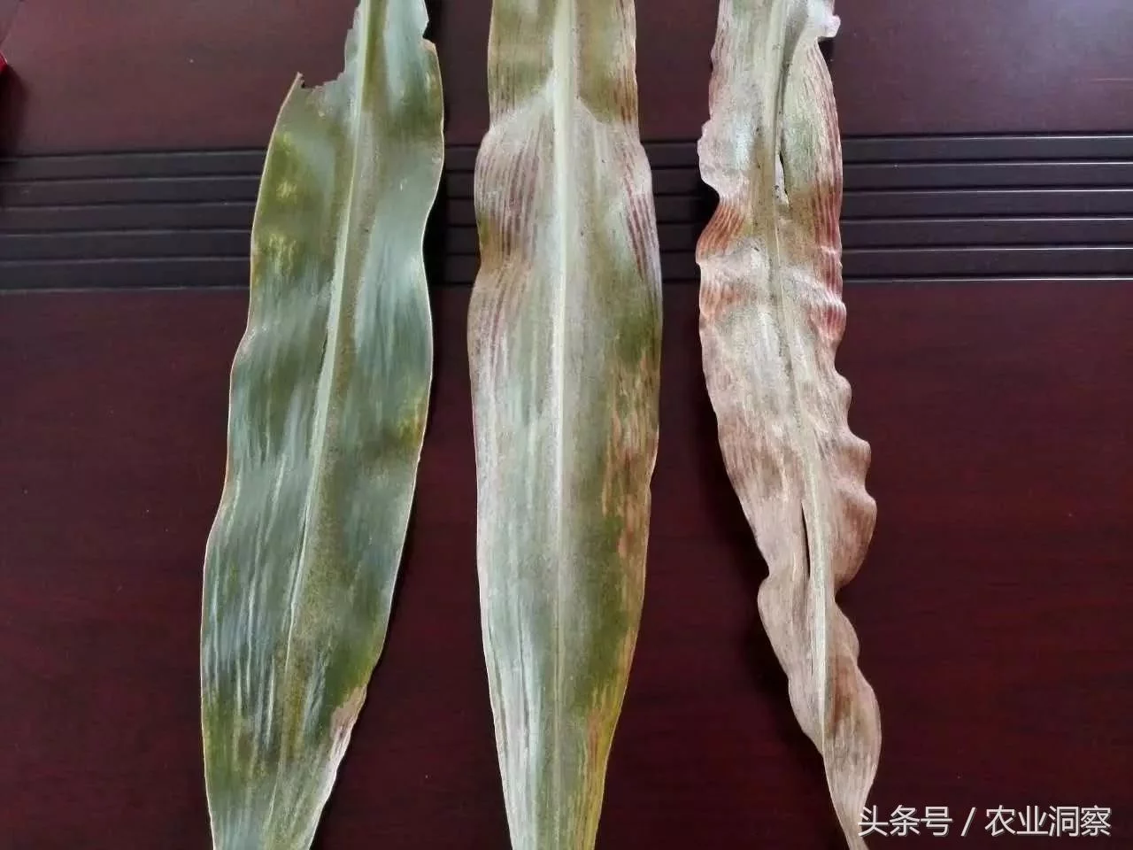 左边叶子为无人机防治后的效果(植株中上方叶片),中间的是玉米底部叶子防治的效果,最右边是没有防治的效果,植保无人机对红蜘蛛的防治效果得到了当地农户和植保部门的认可。