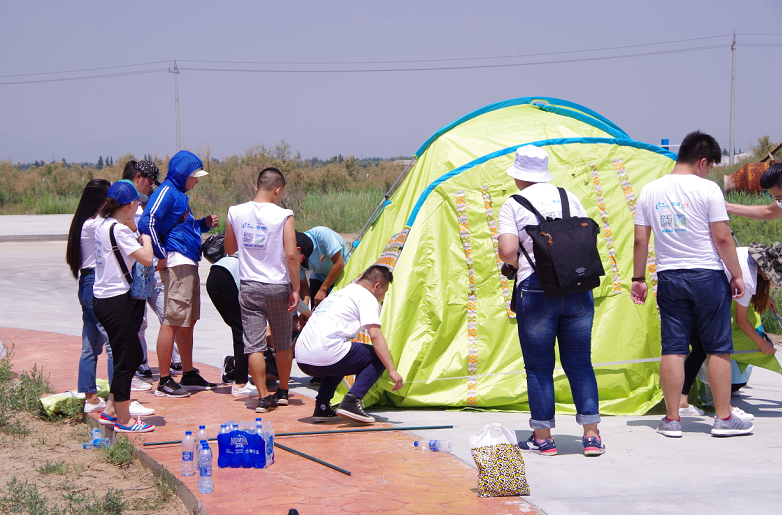 到达露营地点后, 经过一番短暂的学习,他们很快就掌握了搭建帐篷的要领,然后彼此分工合作,没过一会功夫,他们就基本完成帐篷搭建。