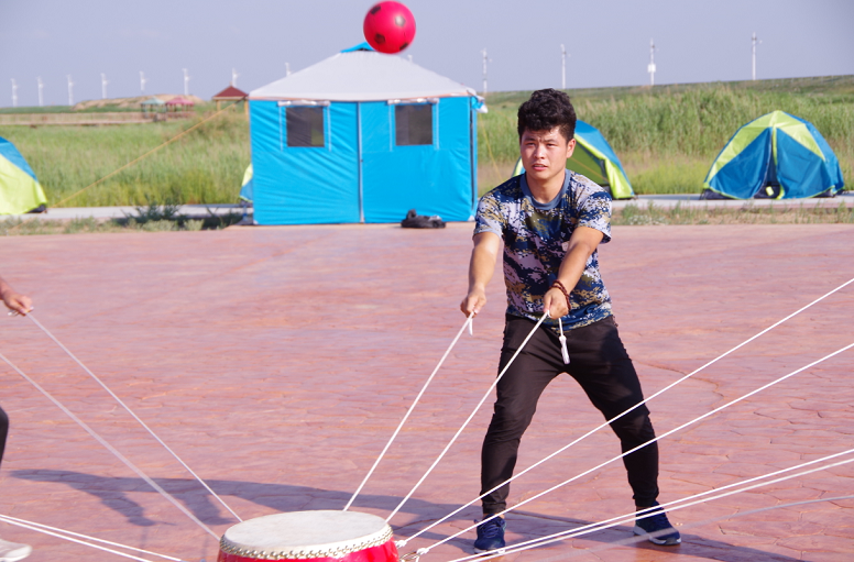 当红色的小球被直抛到空中时,一次别开生面的“颠鼓击球”游戏就已经开始了,一颠一击的过程看似简单,但想要玩好却并不那么容易,这讲究的是团队的默契与灵敏度。不过游戏总是能迅速拉近人的距离,而且能让人瞬间找回孩童时期的简单乐趣。