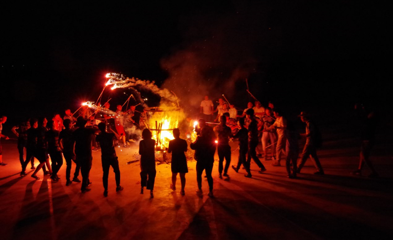 夜幕降临时,空中开始布满了星星,他们在篝火旁一起嬉戏玩闹,点燃烟花,在清风徐徐的夜晚里,尽情享受这美好的一刻。