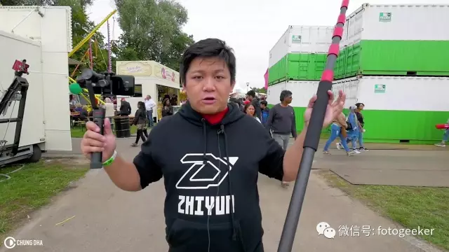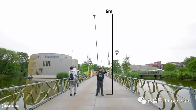 大神主要用了一根5米长的录音杆,并接一台手持稳定器,轻松做到无人机航拍效果。