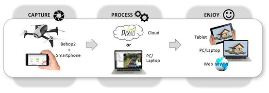 除了提到的Parrot Bebop 2 的诸多特点,借助Pix4D capture APP, Bebop 2 摇身一变又变成了一个专业的摄影测量工具,主要用于创新性的市场应用,如创建商业视频和 3D 交互模型,或者用来捕捉成本估算或 3D 模型印刷所需的测量值等。