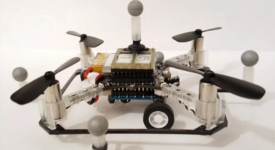 研究人员采用八只四转子“双头直升机”无人机,并在每个无人机的底部放置两个带有轮子的小型电机,使其能够驾驶。在模拟中,机器人可以在其电池耗尽之前飞行约295英尺(90米)或驱动826英尺(252米)。