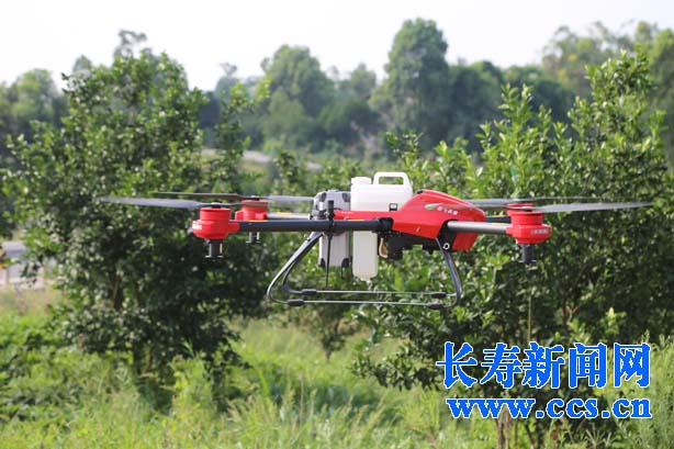 近日,在现代农业园区,一架红色的无人机吸引了来往行人关注。只见无人机在果林中来回穿梭,一条条浅白色的雾带随着无人机定制的航线,如梭般织成飘逸的纱巾,沉降在绿油油的果园里。