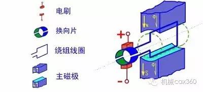 上图的直流电机的物理模型图,固定部分有磁铁,这里称作主磁极;固定部分还有电刷。转动部分有环形铁心和绕在环形铁心上的绕组。(其中2个小圆圈是为了方便表示该位置上的导体电势或电流的方向而设置的)